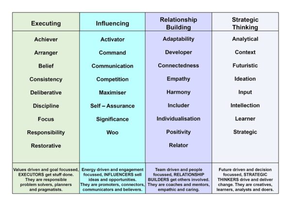Gallup Strengths, also known as Clifton Strengths Finder, are 34 talent themes identified by an online assessment that uncover an individual’s natural patterns of thought, feeling, and behaviour. These are categorised into four domains: Executing, Influencing, Relationship Building, and Strategic Thinking. The assessment helps people understand their innate abilities to develop their greatest talents into strengths for professional and personal growth.