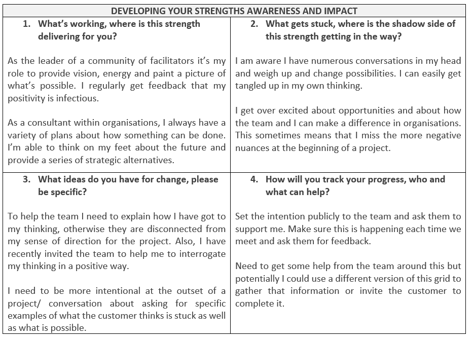 Importantly this is about thinking in detail about actual examples where they can identify where they are playing ‘unconsciously to their strengths’ and also where the ‘shadow side of their strengths’ gets in the way.