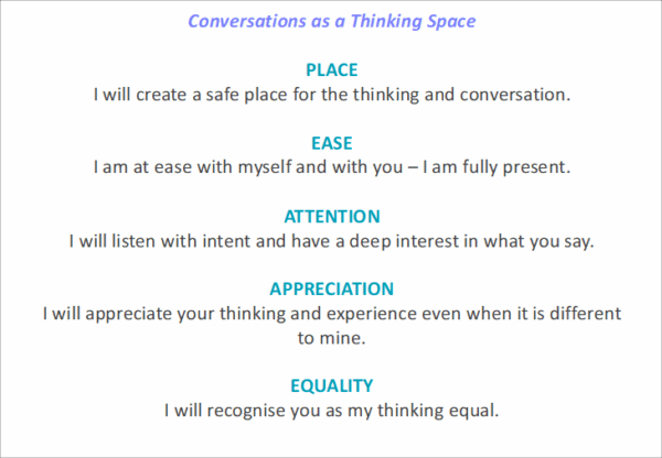 Nancy Kline who developed the concept of Thinking Environments, describes the role of the person supporting the thinking, as being both essential and irrelevant. In a world where leaders are expected to come up with the answers, this is a different kind of conversation where you use inquiry and deep listening to create space for others to think.