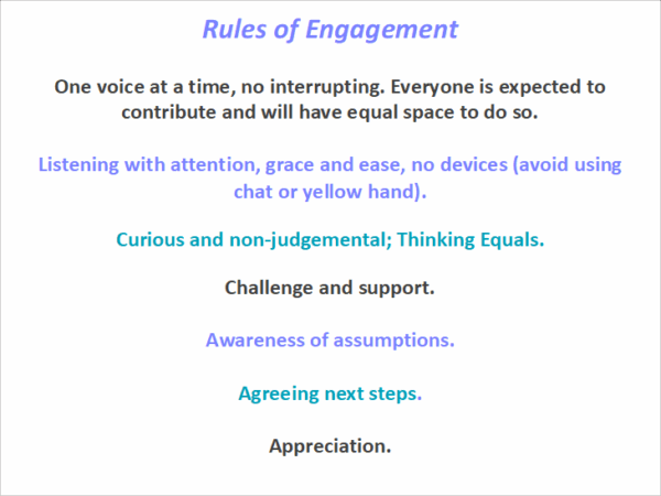 After you have the time agreed and you are clear on what the conversation is focusing on and what tools/frameworks you are using, the next step is setting the Rules of Engagement. These work in all situations, online, in person, 1-1 and with groups. You have all experienced this way of working on the programme with myself and the team. We have discovered that these Rules of Engagement are game changing in terms of engagement and progression.